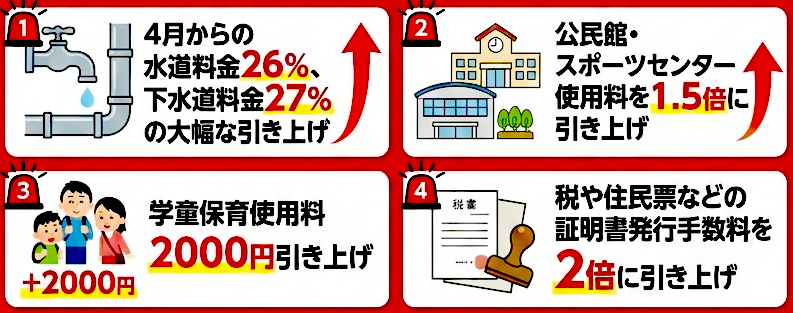 - 水道料金: 4月から水道料金26%・下水道料金27%の引き上げ